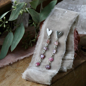 Natural Spinel, Sapphire, & Ruby gemstones in shades of peach, purple, and pink are each meticulously hand set in sterling silver prongs and dangle and dance freely below hand sculpted sterling silver hearts. Beautiful and One of a Kind.